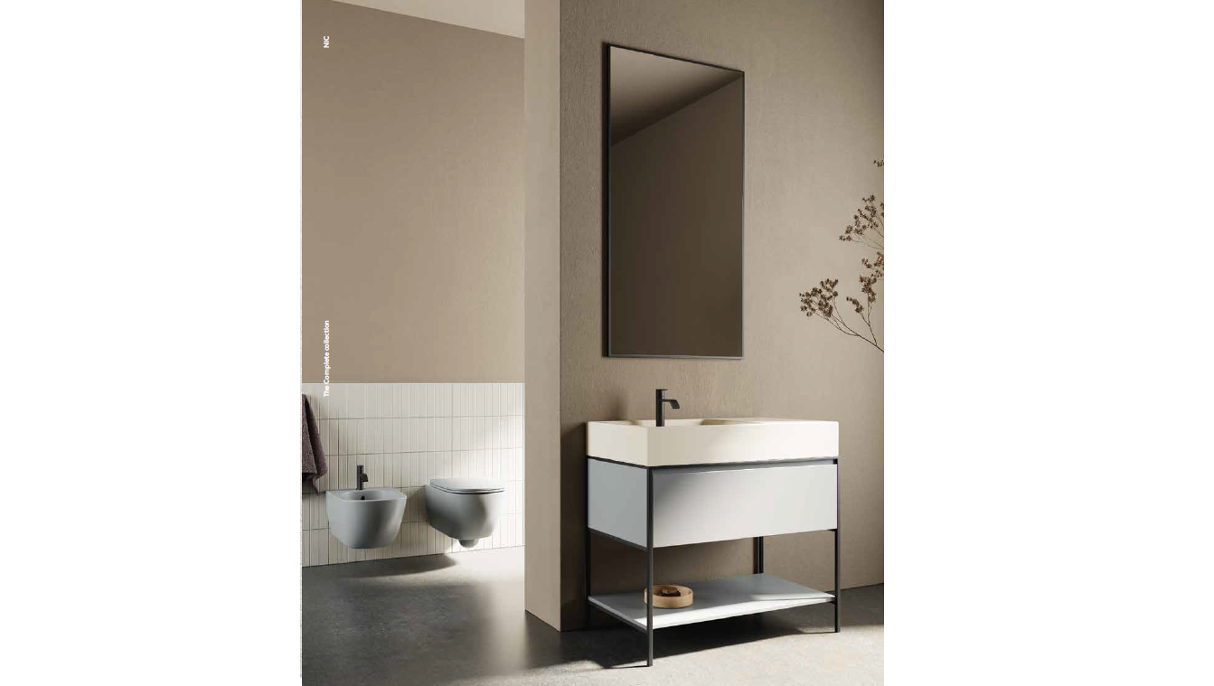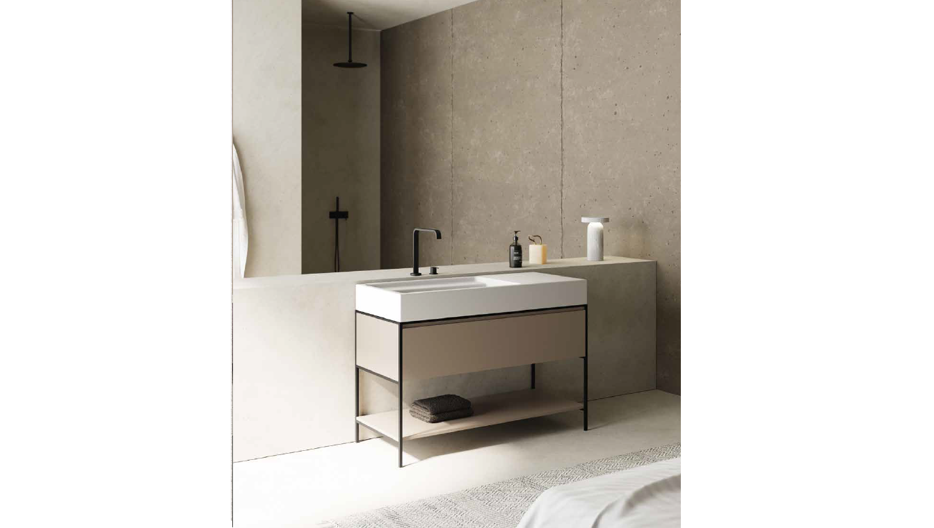 Uno composizione dal design semplice e confortevole con dei volumi accoglienti e pratici composto da un lavabo in ceramica da 90.120 con ampio bacino e piano di appoggio disponibile in tutte le 28 nuances della Color collection. Il grande mobile contenitivo costituito da uno spazioso cassetto, con all'interno il vanity, ed il piano, possono essere laccati o in essenza. La struttura in acciaio e disponibile nella finitura nero matt e bronzo spazzolato.