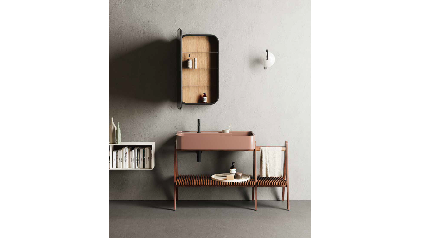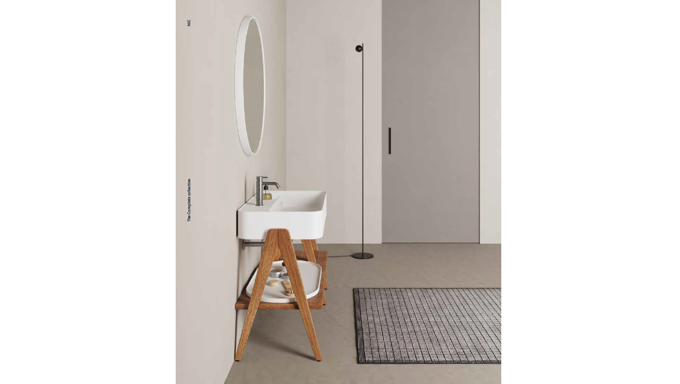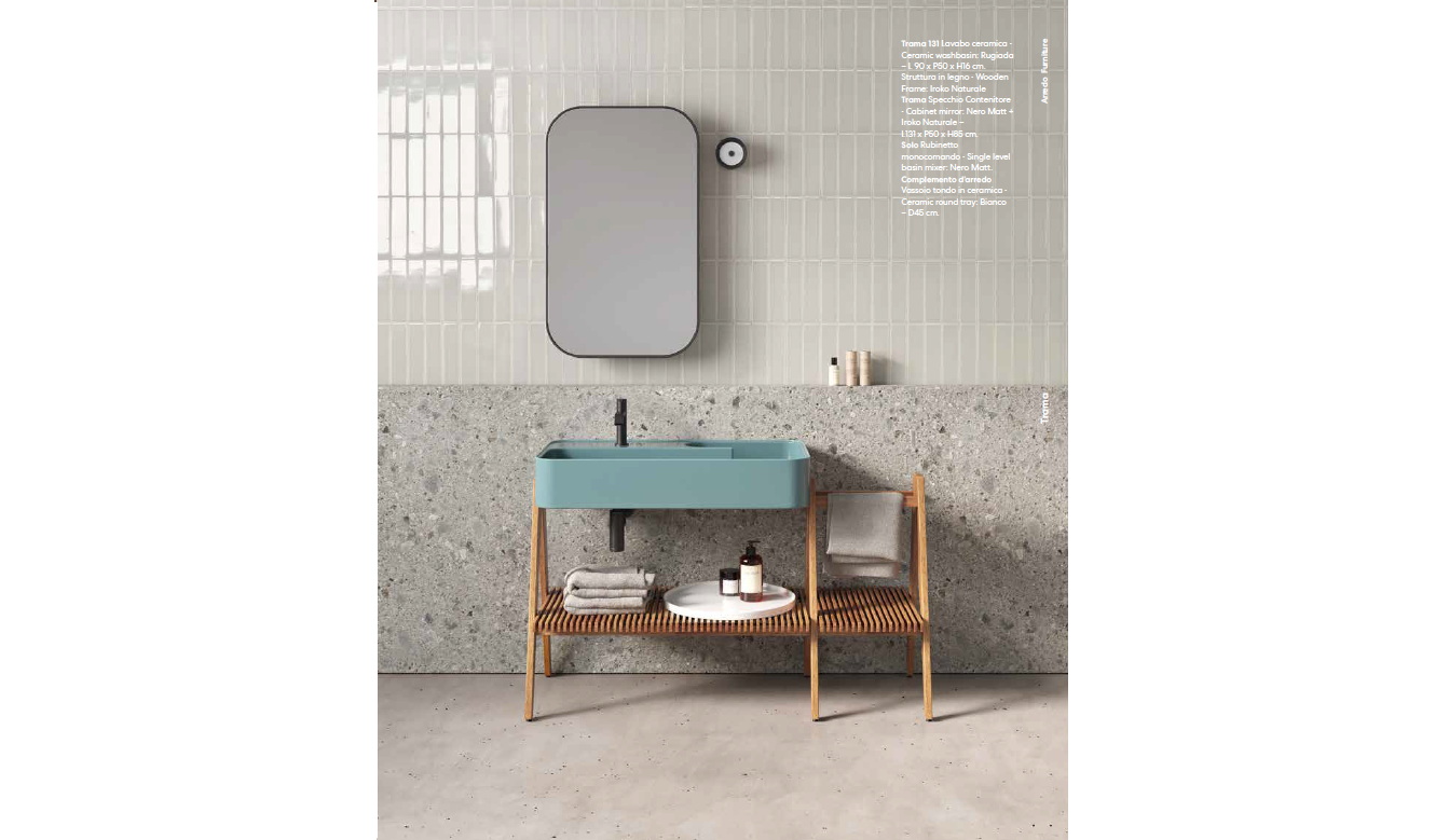 Lo silhouette essenziale soddisfa il desiderio tra lifestyle contemporaneo e tradizione. Trama è composto da due elementi materici principali, il legno massello di iroko con anima in accidio e il lavabo in ceramico concepito come un contenitore morbido e fluido creando al suo interno uno spazio porta oggetti.