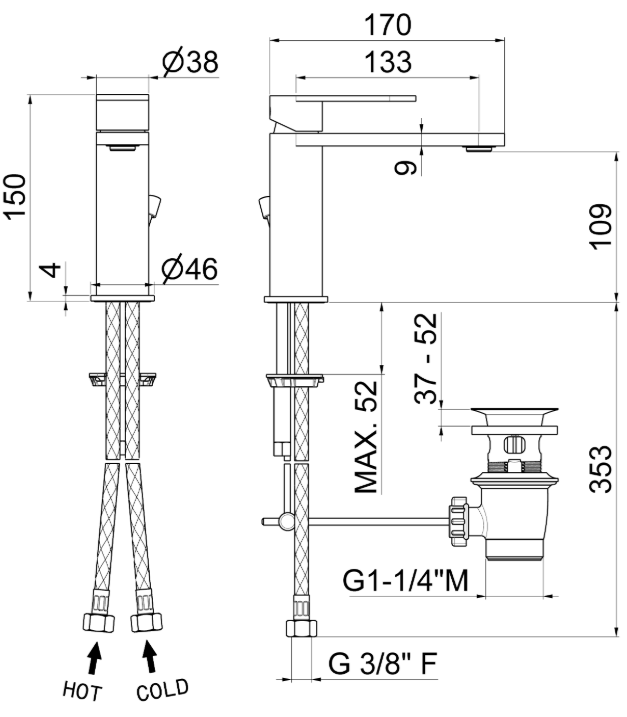 Miscelatore monocomando per lavabo con scarico da 1”1/4.