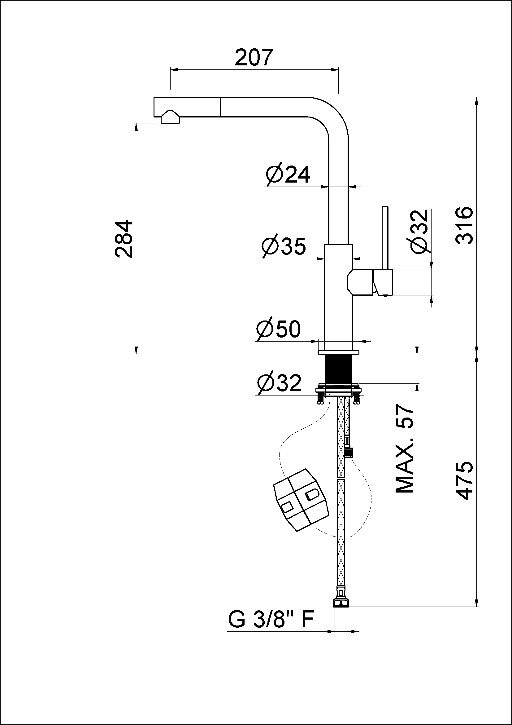 Miscelatore monocomando per lavello con canna “L” girevole e doccetta estraibile.