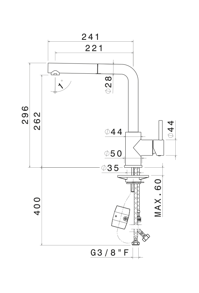 Miscelatore monocomando per lavello con canna “L” girevole e doccetta estraibile.